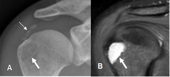 A: Rx AP y B: RM coronal en STIR. Calcificaciones sobre la topografía del tendón supraespinoso, por tendinitis crónica. Sobre la tuberosidad mayor se aprecia imagen radiolúcida y de aspecto benigno, que corresponde a lesión quística confirmada con la RM.