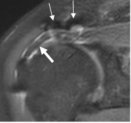 RM coronal en STIR. Cambios PostQx en la articulación acromioclavicular, que producen artefactos. (Flechas delgadas). Signos de tendinitis del supraespinoso, el cual está adelgazado y rodeado por líquido. (Flecha gruesa).