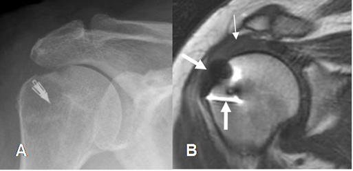 B: RM coronal en T2. Reconstrucción de lesión del manguito, con un tendón del supraespinoso engrosado e hiperintenso, por tendinitis crónica. (Flecha delgada). Se aprecian artefactos metálicos. (Flecha gruesa).