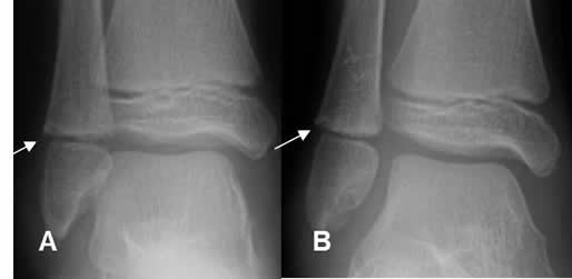La mayoría de las fracturas en niños afectan las placas de crecimiento. Son mas comunes en la placa distal de la tibia y el radio. No se debe confundir la línea de fractura radiolúcida, con el cartílago de crecimiento. En los casos dudosos se recomienda las proyecciones comparativas. (1, 3).Salter y Harris las clasificaron en: (1, 3, 6, 7).