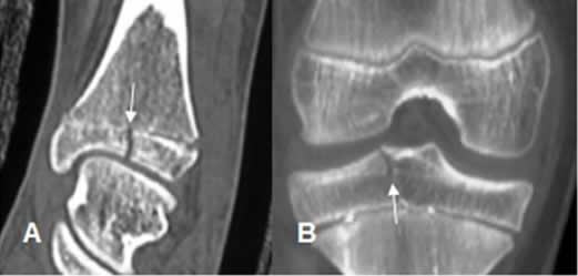 A: TAC reconstrucción sagital y B: TAC reconstrucción coronal. Fracturas verticales en las epífisis de la tibia, por lesiones tipo III.