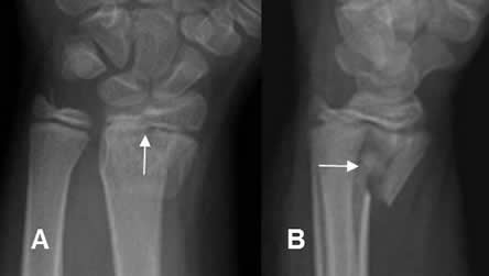 A: Rx AP y B: Rx lateral. Fractura impactada y con angulación anterior, en el radio distal, con compromiso de la epífisis y metáfisis.