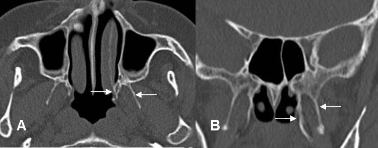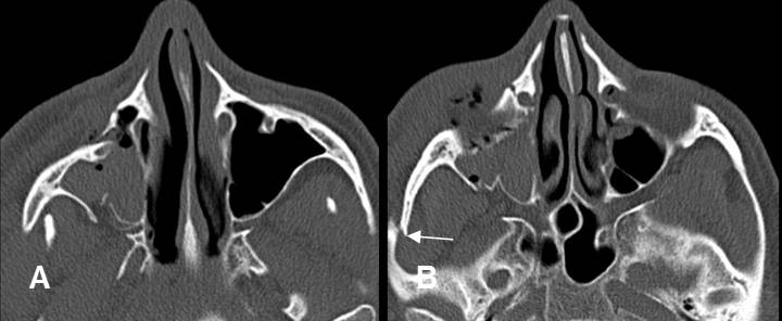 A: TAC axial y B: TAC reconstrucción coronal. Láminas pterigoideas normales.