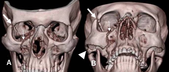 A y B: TAC reconstrucción 3D. Fractura trimalar con lesión de la unión cigomático-maxilar (Flecha delgada), cigomático-frontal (Flecha gruesa) y cigomática-temporal (Punta de flecha).