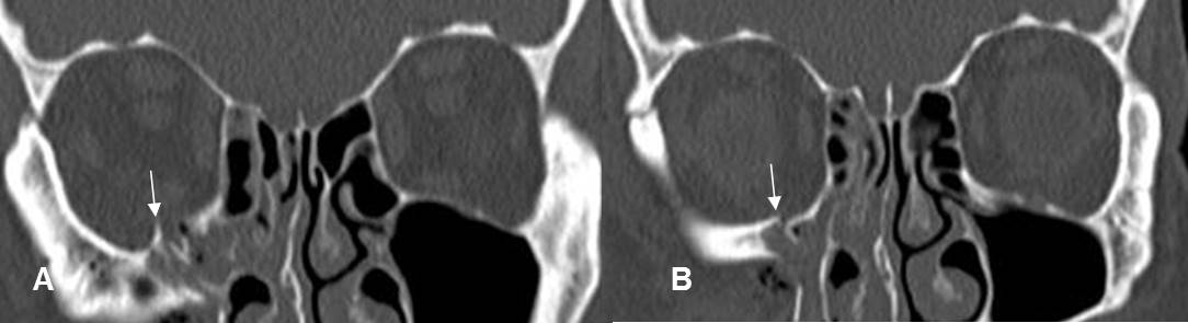 A: TAC axial y B: TAC reconstrucción coronal. Músculos recto interno (Flechas delgadas) y recto inferior (Flechas gruesas) normales. Ambos tienen forma ovalada.
