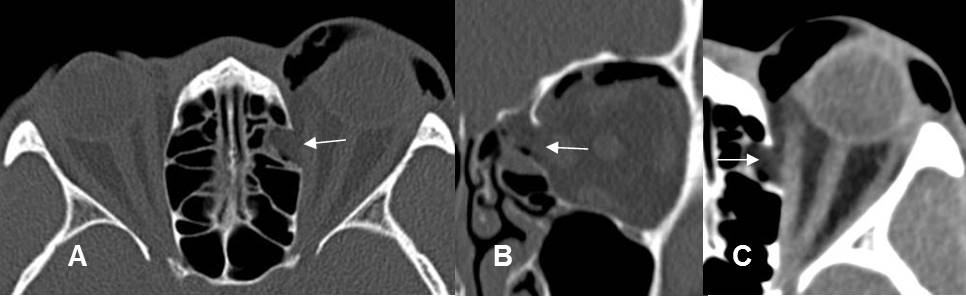 A: TAC axial. Fractura de la lámina pterigoidea y el piso de la órbita derecha.
