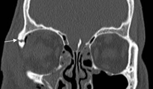 TAC reconstrucción coronal. Fractura no desplazada en el borde lateral de la órbita.