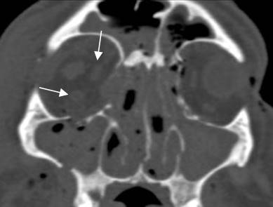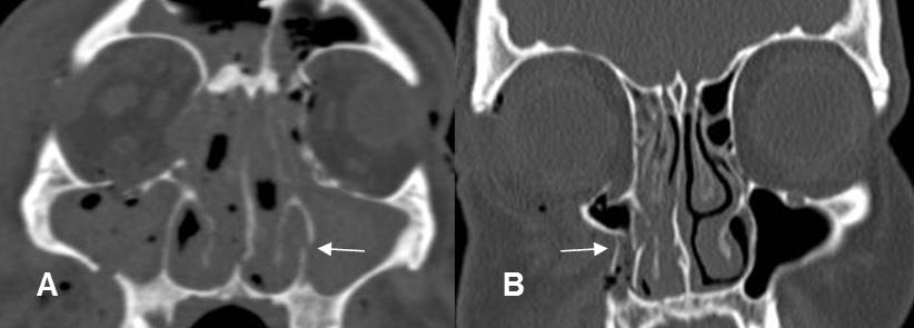 A y B: TAC axial. Fracturas en el piso y pared posterior del antro maxilar derecho.