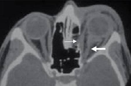 TAC axial. Fractura en el borde medial de la órbita con edema del músculo recto interno. Está desplazado medialmente y se debe sospechar su atrapamiento. (Flecha delgada). Adicionalmente hay cambios inflamatorios en el espacio intraconal e irregularidad del nervio óptico. (Flecha gruesa).