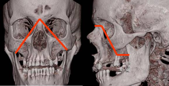 Fractura en forma piramidal, con ápex en la sutura nasofrontal y base en los dientes.