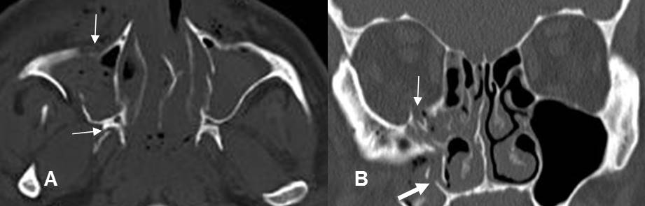 A: TAC axial y B: TAC reconstrucción coronal. Fracturas de las láminas pterigoideas, hallazgo indispensable para hace el diagnóstico de fractura de Le Fort.