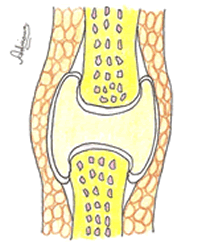 Huesos separados por el espacio articular (Amarillo claro), que contiene líquido.