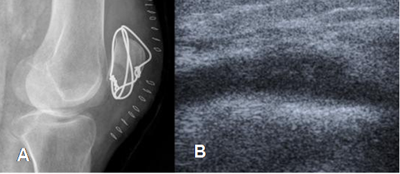 A: Rx lateral. Artritis infecciosa, como complicación de la reducción abierta, de una fractura de patela.