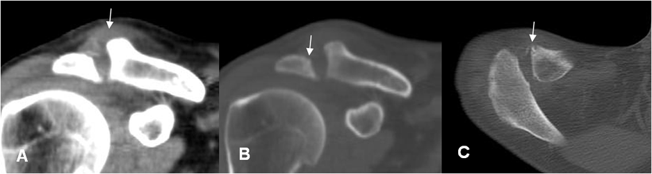 B: TAC reconstrucción coronal y C: TAC axial. Incipientes esrosiones óseas en la clavícula y el acromión, por artritis infecciosa.