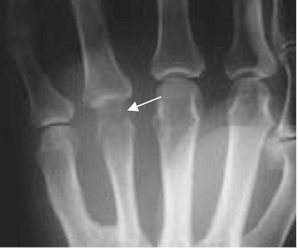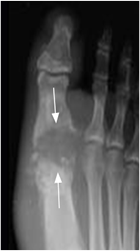 Rx AP. Artritis infecciosa del pulgar, con zonas de osteolisis en la base de la falange y la cabeza del metatarsiano. (Flechas). Hay edema asociado de los tejidos blandos.