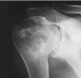 Rx AP. Disminución, irregularidad y esclerosis del espacio glenohumeral, como secuelas de artritis infecciosa.