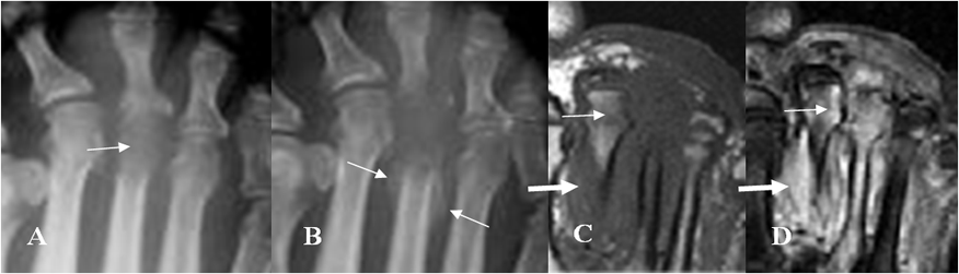 C: RM axial en T1 y B: RM axial en STIR. 3º metatarsiano hipointenso en T1 e hiperintenso en STIR, con destrucción de su cabeza, por osteomielitis. Hay extensión por contigüidad de los cambios inflamatorios a la cabeza del 2º metatarsiano (Flechas delgadas) y edema en los tejidos blandos adyacentes. (Flechas gruesas).
