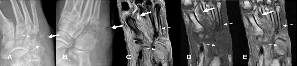 Huesos del medio pie hipointensos en T1, hiperintensos en STIR y con realce del contraste. (Flechas delgadas). Adicionalmente hay pequeña colección de tejidos blandos, entre el 1º y 2º metatarsianos, sin realce. (Flecha gruesa).