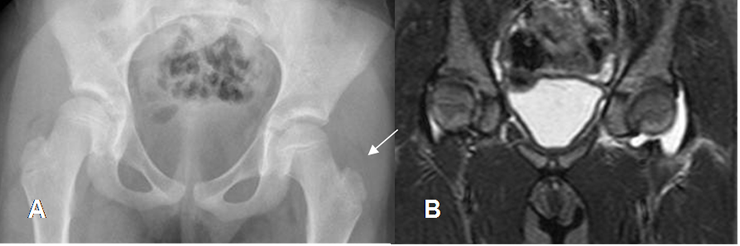 A: Rx pelvis AP. Desplazamiento del cojinete graso de la cadera, como signo de derrame articular. (Comparar con el contralateral).