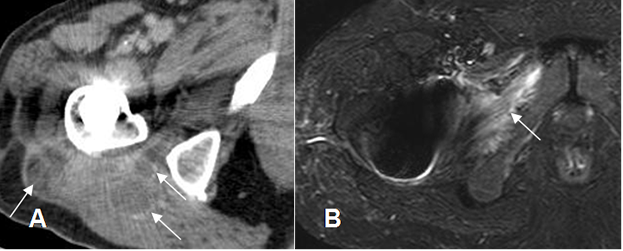 A: TAC axial con contraste. Artritis como complicación de prótesis en la cabeza femoral. Inflamación de tejidos blandos, con incipiente formación de abscesos, cuyos bordes captan el contraste. (Flechas).