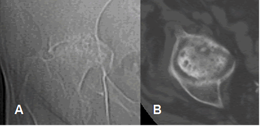 A: Rx AP y B: TAC axial. Cambios residuales en la cadera, luego de una artritis séptica. Hay remodelación de la cabeza femoral y la cavidad acetabular, con pérdida del espacio, esclerosis y erosión.