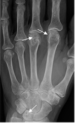 Característico la osteopenia, disminución simétrica del espacio articular, erosiones en los sitios de inserción capsular o ligamentaria (Flechas) y sinovitis.