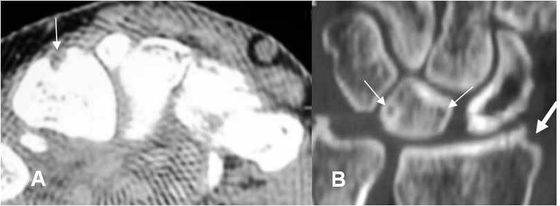 A: TAC axial y B: TAC reconstrucción coronal. Erosiones en los huesos semilunar (Flecha delgada) y en el borde lateral del radio. (Flecha gruesa).