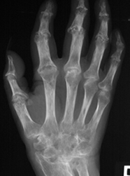 Rx AP. Enfermedad avanzada en la mano, con osteoporosis periarticular, disminución de los espacios articulares interfalángicos, radio y ulnocarpiano y fusión de los huesos del carpo.