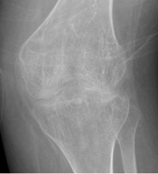 Rx AP. Enfermedad avanzada con osteoporosis, disminución simétrica del espacio articular y deformidad.