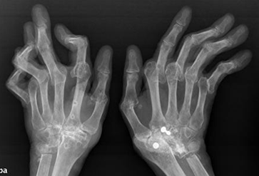 B: Estado mas avanzado con varias erosiones en los metacarpianos y las falanges.