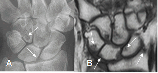 A: Rx AP. Erosiones del semilunar y el ganchoso.