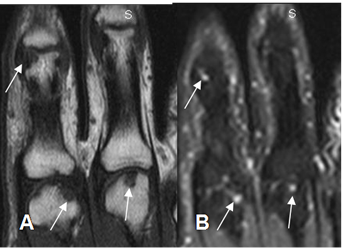 A: RM coronal en T1 y B: RM coronal en STIR. Presencia de erosiones marginales en los metacarpianos y la falanges proximales, hipointensas en T1 e hiperintensas en STIR.