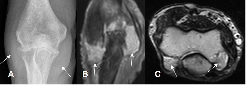 A: Rx AP. Osteopenia generalizada, con disminución de espacios articulares y prominencia de los tejidos blandos, a nivel bilateral. (Flechas).