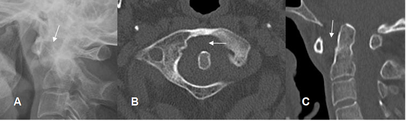 A: Rx lateral, B: TAC axial y C: TAC reconstrucción sagital. Aumento del espacio atlantoaxial y sin antecedente de trauma, por laxitud ligamentaria.
