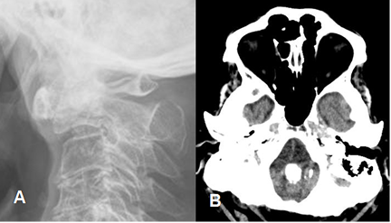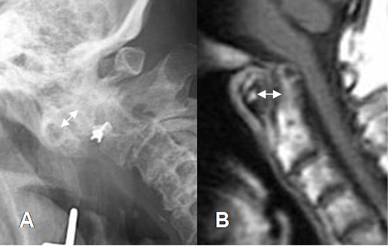 A: Rx lateral y B: RM sagital en T1. Aumento del espacio entre el arco anterior de C1 y la odontoides, por laxitud ligamentaria.