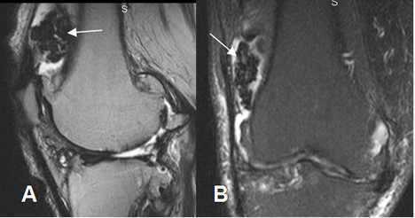 A: RM sagital en T2 y B: RM coronal en STIR. Signos de sinovitis, con proliferación sinovial suprapatelar. (Flechas). Las lesiones son hipointensas, por el contenido de hemosiderina y fibrosis.