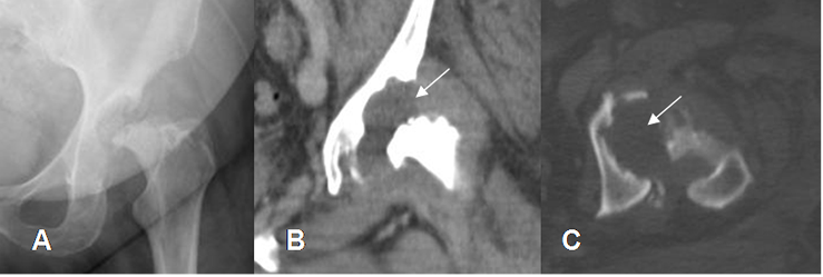 B: TAC reconstrucción coronal y C: TAC axial. Destrucción de la cabeza femoral y la cavidad acetabular, con tejido blando que ocupa el espacio articular. Flechas).