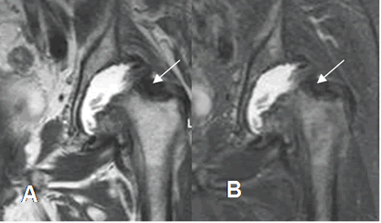 A: RM coronal en T2 y B: RM coronal en STIR. Derrame articular, con proliferación hipointensa de la sinovial, que rodean el cuello femoral. (Flechas).
