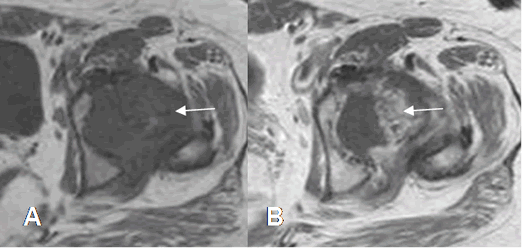A: RM axial en T1 y B: RM axial en T1 con contraste. Proliferación sinovial, que realza con el contraste. (Flechas).