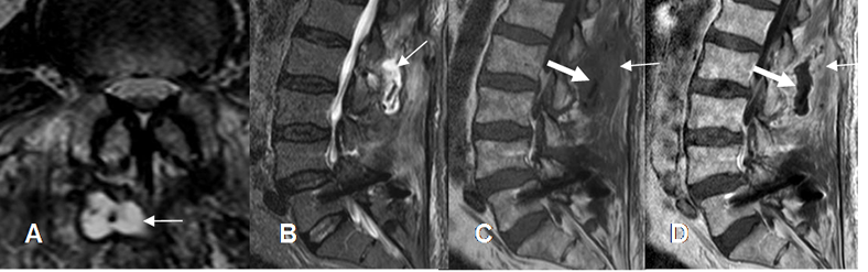 C: RM sagital en T1 y D: RM sagital en T1 con contraste. Cambios inflamatorios de tejidos blandos, hipointensos y que realzan con el contraste (Flecha delgada). La colección no realza y corresponde a absceso. (Flecha gruesa).