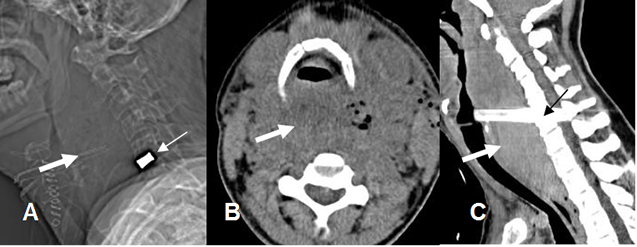A: Rx lateral, B: TAC axial y C: TAC reconstrucción sagital. PostQx de prótesis de disco, en el espacio C5-C6. (Flecha delgada). Formación de colección prevertebral, que desplaza y comprime la vía aérea. (Flecha gruesa).