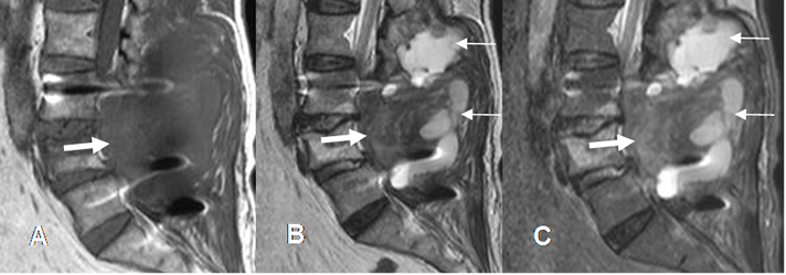 A: RM sagital en T1, B: RM sagital en T2 y C: RM sagital en STIR. PostxQx de laminectomía y fijación posterior. El paciente evoluciona con paraparesia y se encuentran cambios inflamatorios y colecciones de tejidos blandos. (Flechas delgadas). El canal medular está ocupado por imagen hipointensa en todas las secuencias (Flechas gruesas),