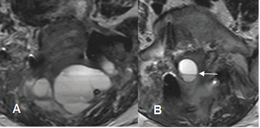 A y B: RM axial en T2. Igual paciente anterior. Colección de tejidos blandos en A y dentro del canal en B, la cual presenta nivel líquido/líquido, por hematomas PostQx.