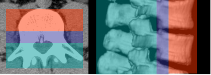 A: TAC axial y B: TAC reconstrucción sagital. Columna anterior (Rojo), columna media (Azul) y columna posterior (Verde).