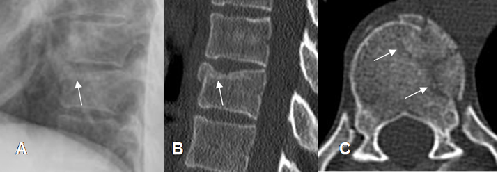 A: Rx lateral, B: TAC reconstrucción sagital y C: TAC axial. Fractura en la parte anterosuperior del  cuerpo vertebral, con compromiso solo de la columna anterior.
