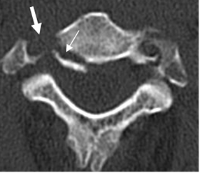 TAC axial. Fractura en la parte posterior del cuerpo, que corresponde a la columna media. (Flecha delgada). Igualmente hay fractura de la apófisis transversa, con compromiso del canal de la arteria vertebral. (Flecha gruesa).