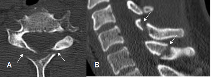 A: TAC axial y B: TAC reconstrucción sagital. Fractura no desplazada de ambas láminas vertebrales, por lesión estable.