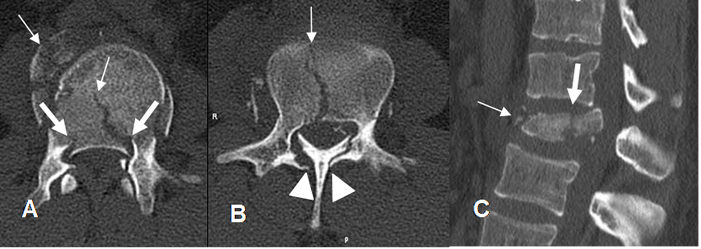 A y B: TAC axial y C: TAC reconstrucción sagital. Fractura conminuta en el cuerpo vertebral, con compromiso de la columna anterior (Flecha delgada), media (Flecha gruesa) y posterior (Punta de flecha), lo que la define como radiológicamente inestable. Se aprecia fragmento retropulsado y desplazamiento anterior de la apófisis espinosa, dentro del canal.