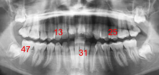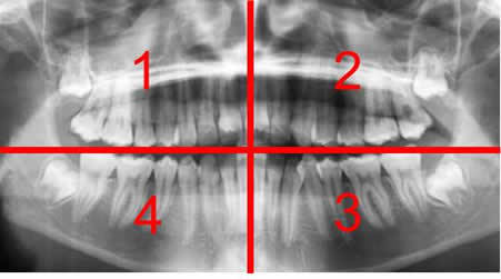 Rx panorámica. División de la dentición en 4 cuadrantes.