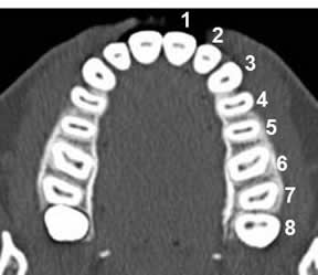 Cada cuadrante contiene 8 dientes y se enumeran de forma creciente, empezando por la línea media y en dirección distal. Las decenas indican el cuadrante y las unidades, la situación del diente en el cuadrante. (6, 8). (Fig 11).